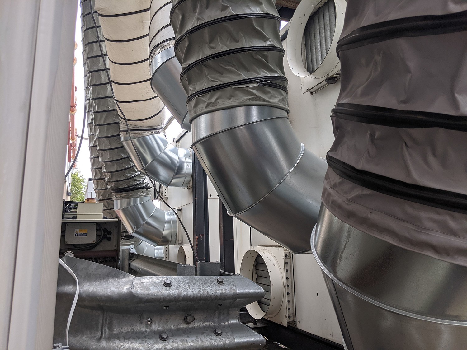 Ductwork from a HVAC unit feeding into a building for event ventilation and cooling